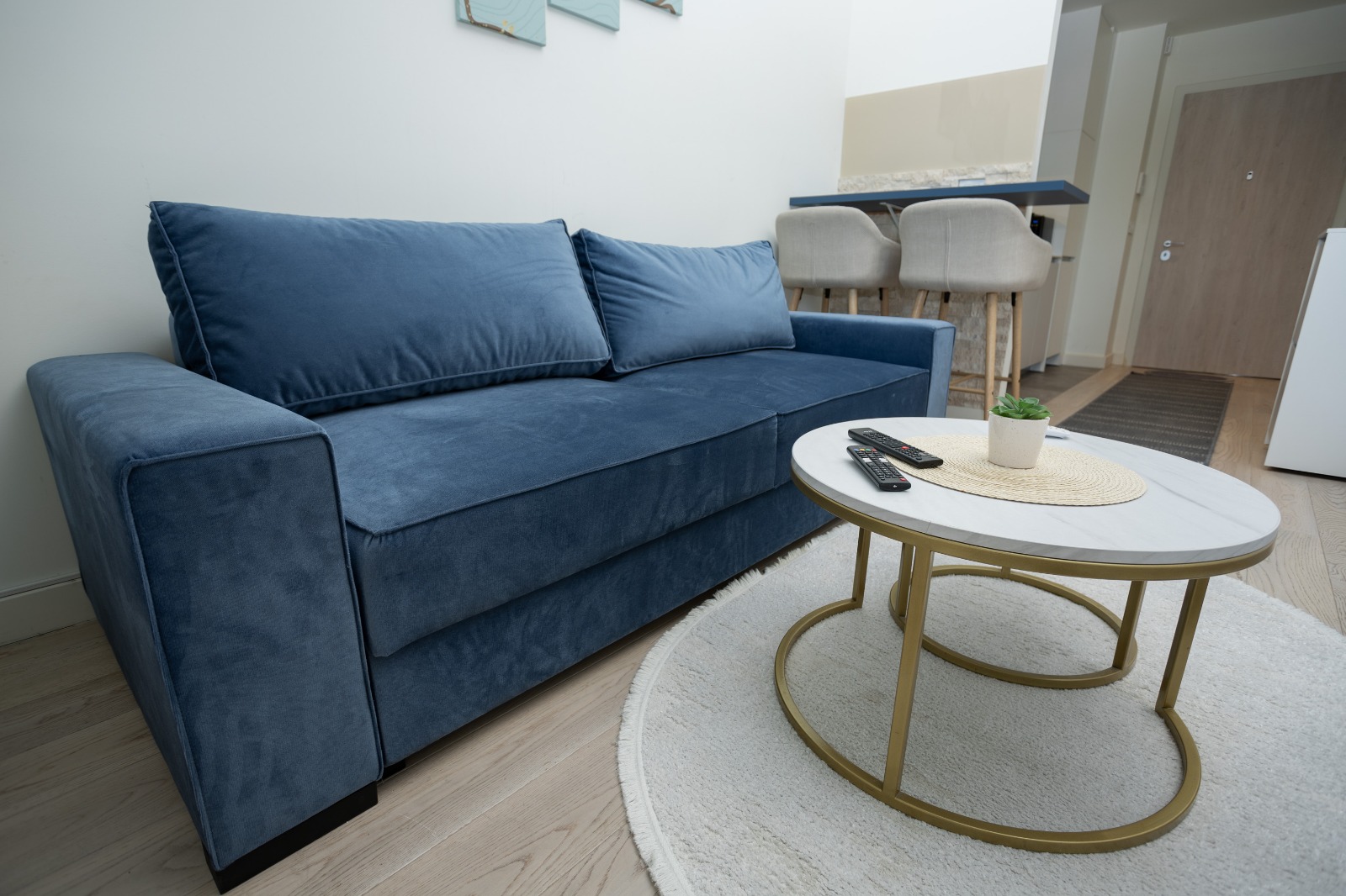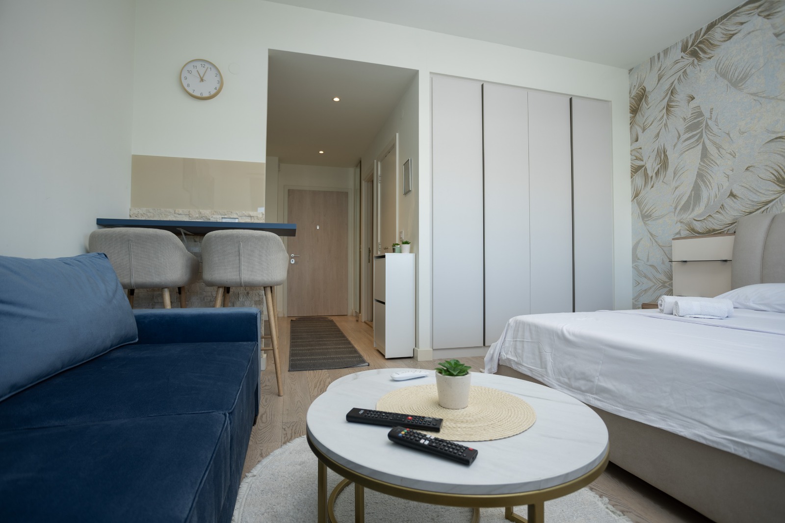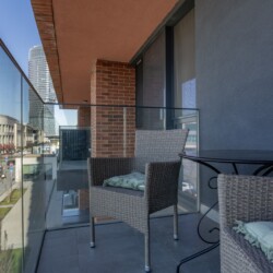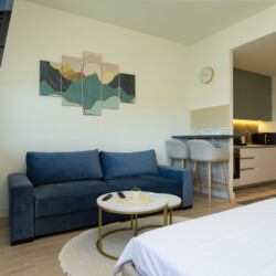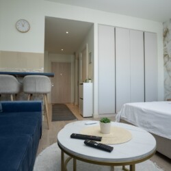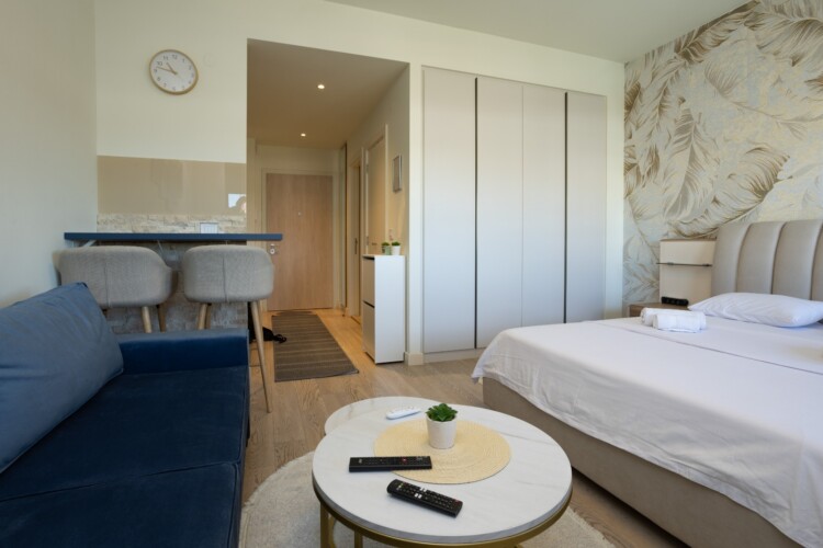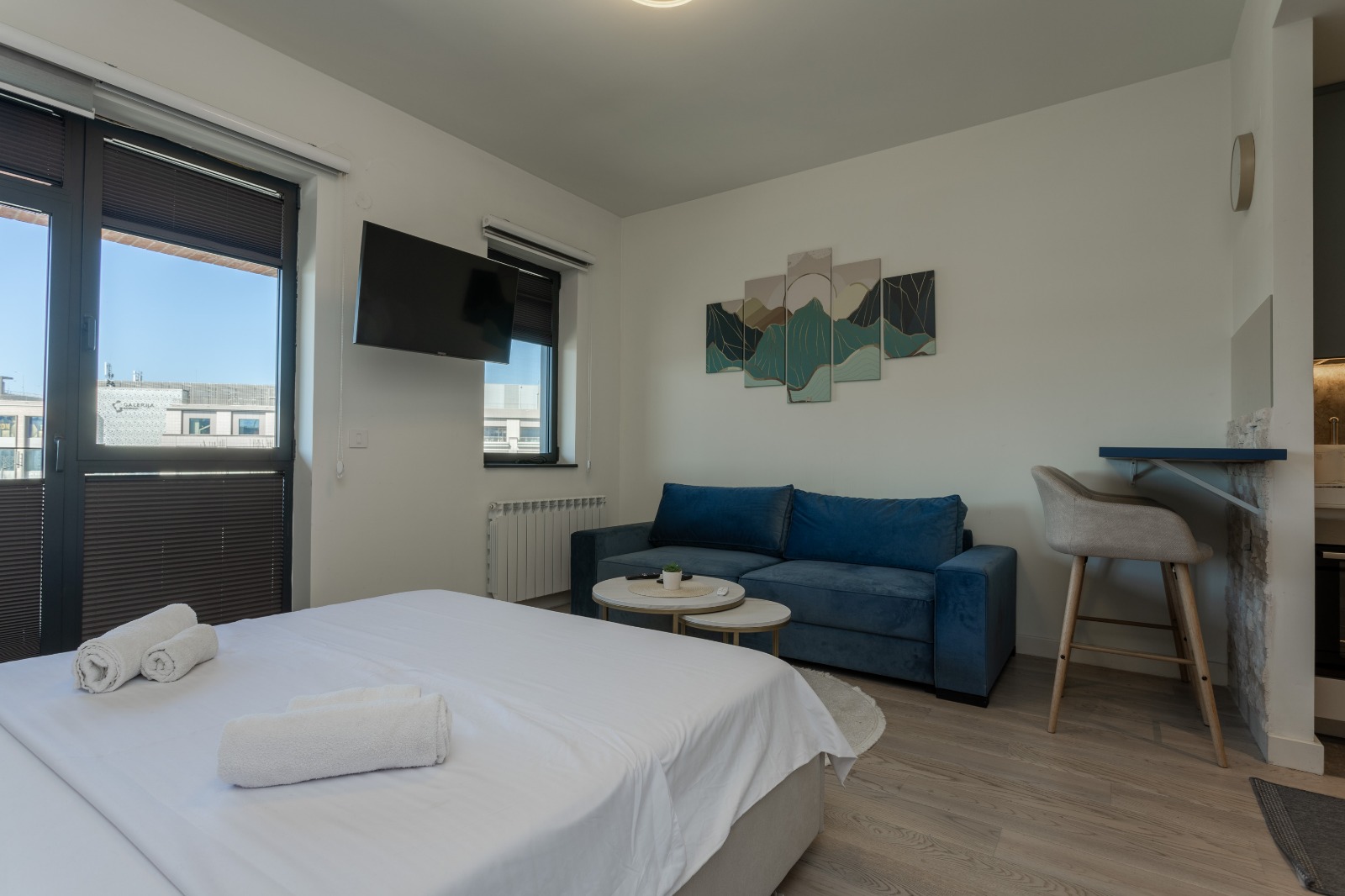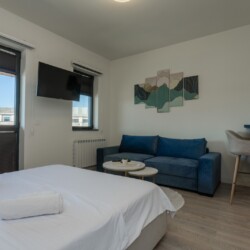 Glavni adut ovog prostora je terasa sa koje se pruža direktan pogled na tržni centar Galerija i veličanstvenu Kulu Beograd. To je idealno, intimno mesto da uz prvu jutarnju kafu posmatrate kako se grad budi ili da uživate u svetlima metropole pred spavanje. Enterijer je pažljivo osmišljen da pruži maksimalnu udobnost, gde centralno mesto zauzima luksuzni francuski ležaj u spavaćoj zoni, dok funkcionalna sofa na razvlačenje pruža dodatnu fleksibilnost za porodice ili prijatelje.
