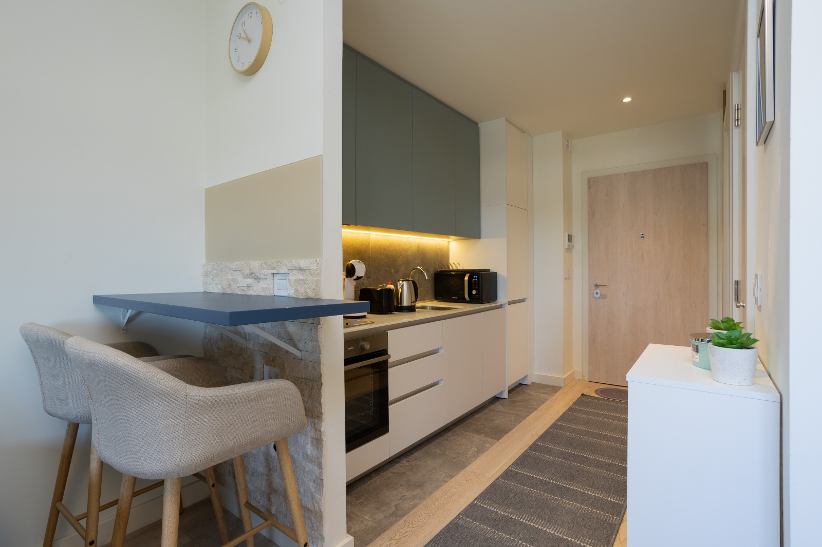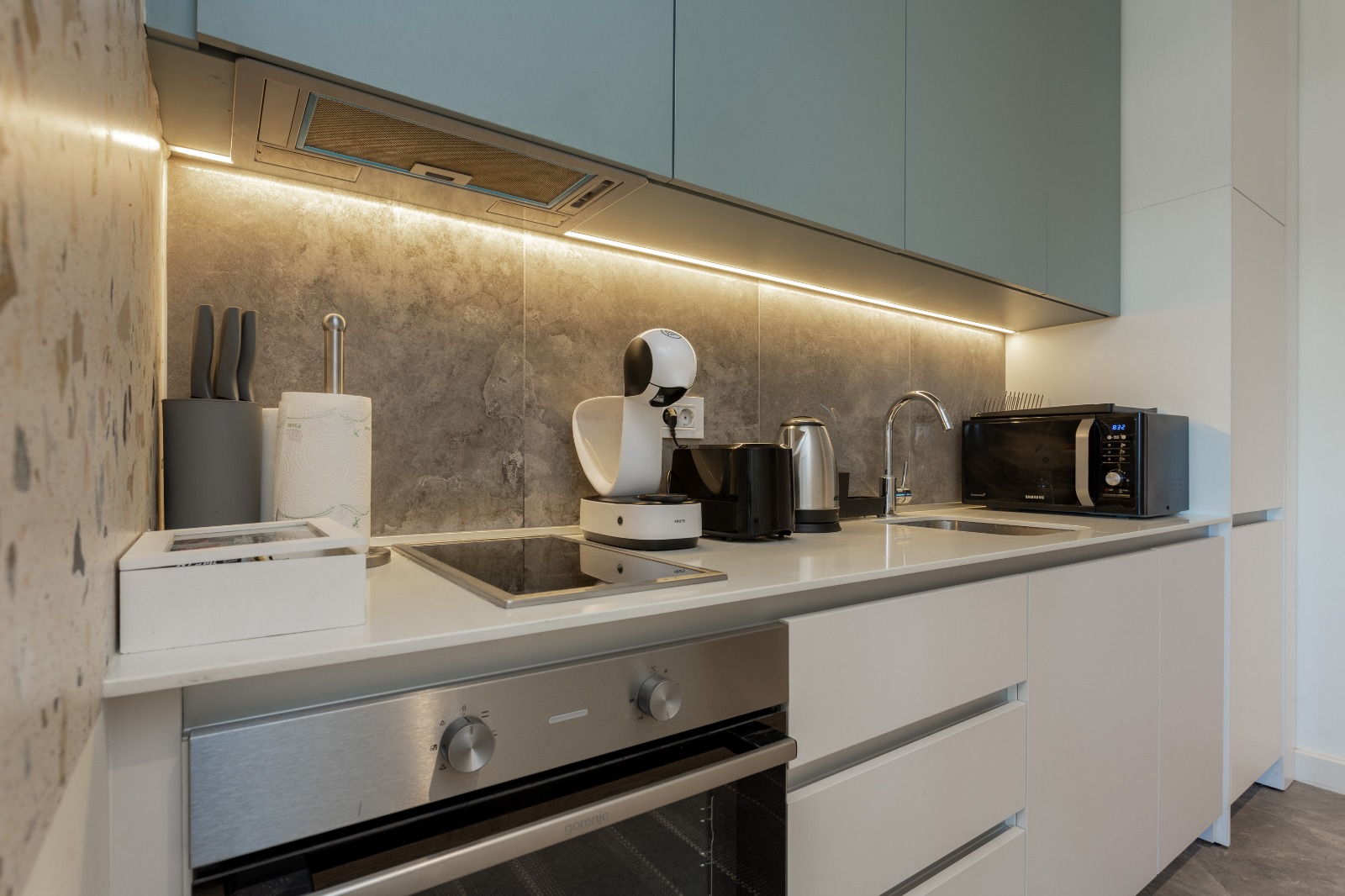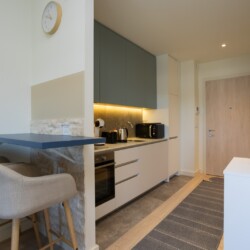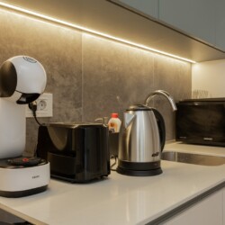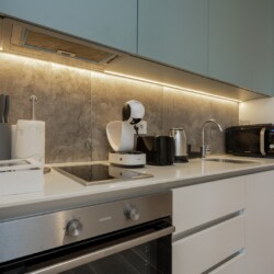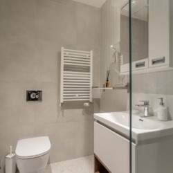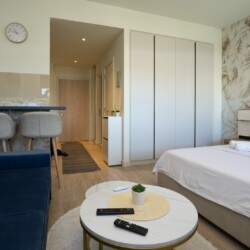 Moderna trpezarija i potpuno opremljena kuhinja omogućavaju vam potpunu samostalnost, bilo da dolazite turistički ili planirate duži poslovni boravak. Kupatilo sa modernom walk-in tuš kabinom i vrhunskom keramikom dodatno doprinosi osećaju čistog luksuza koji prati čitav kompleks Beograda na vodi.